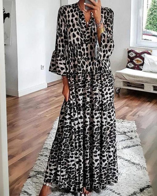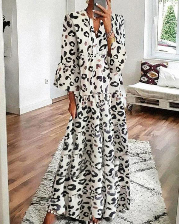 Fashion Leopard Print Dress Flare Sleeve Ruffled Hem Maxi Dress