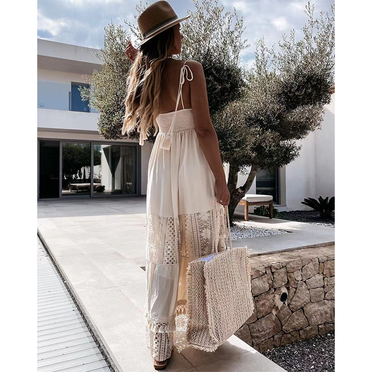 Elegant Lace V- Neck Tassel Solid Color Sling Dress